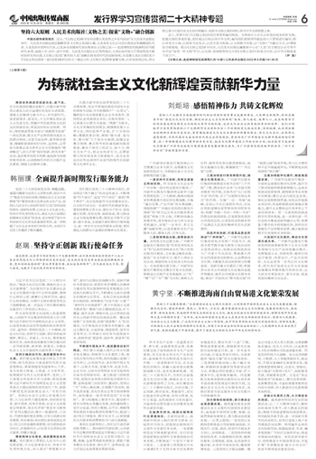 作为文化产业的一名基层亲历者、参与者、实践者和见证者,我真切感受到了党和政府对文化产业的重视,对文化事业和文化产业的加码,海南新华书店即将成为境内关外唯一一家省级新华书店,在完成股权回购后,将融入海南省出版集团战略大局,迎来发展新机遇。党的二十大胜利召开,为我们全面推进文化自信自强,铸就社会主义文化新辉煌指明了方向,我们要坚持以二十大精神为指引,自信自强,守正创新,踔厉奋发,勇毅前行,切实扛起意识形态阵地、宣传主阵地、发行主渠道、全民阅读生力军的重任,为海南自由贸易港文化的繁荣发展作出新的贡献。