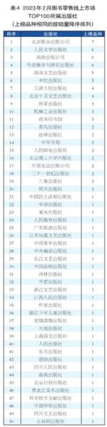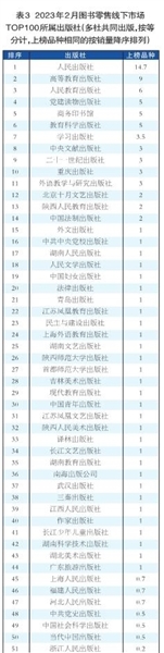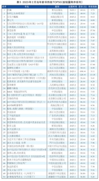2月份,图书零售市场当年新书表现不俗,《狂飙》一举斩获非主题时政图书领衔位,成为当月头号爆款书;多品种跻身全品类热销TOP100。新书热销TOP50(见表5)中,当月出版上市的新书达14种。