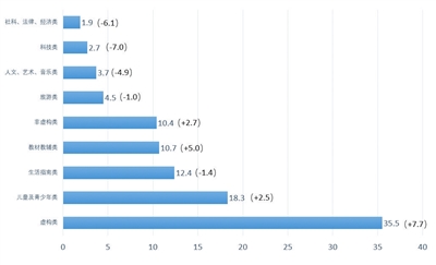 从图书细分类别来看,四大板块对整体销售增长起到了推动作用。2023年,最大的细分类别——小说销售收入占比 35.5%,收入同比增长7.7%。儿童及青少年图书销售收入占比18.3%,收入同比增长2.5%。生活指南类图书销售收入占比 12.4%,收入同比下降1.4%。教材教辅类图书收入占比10.7%,收入同比增长5.0%。非虚构类图书收入占比10.4%,收入同比增长2.7%(见图2)。与2019年相比,小说和儿童及青少年图书收入增长明显,增幅分别为17.0%和8.6%。被列入儿童及青少年图书板块的青少年和新成人图书,在年轻读者中需求旺盛。所有细分类别中,只有小说实现销量增长,同比增长1.1%,较2019年增长2.9%。