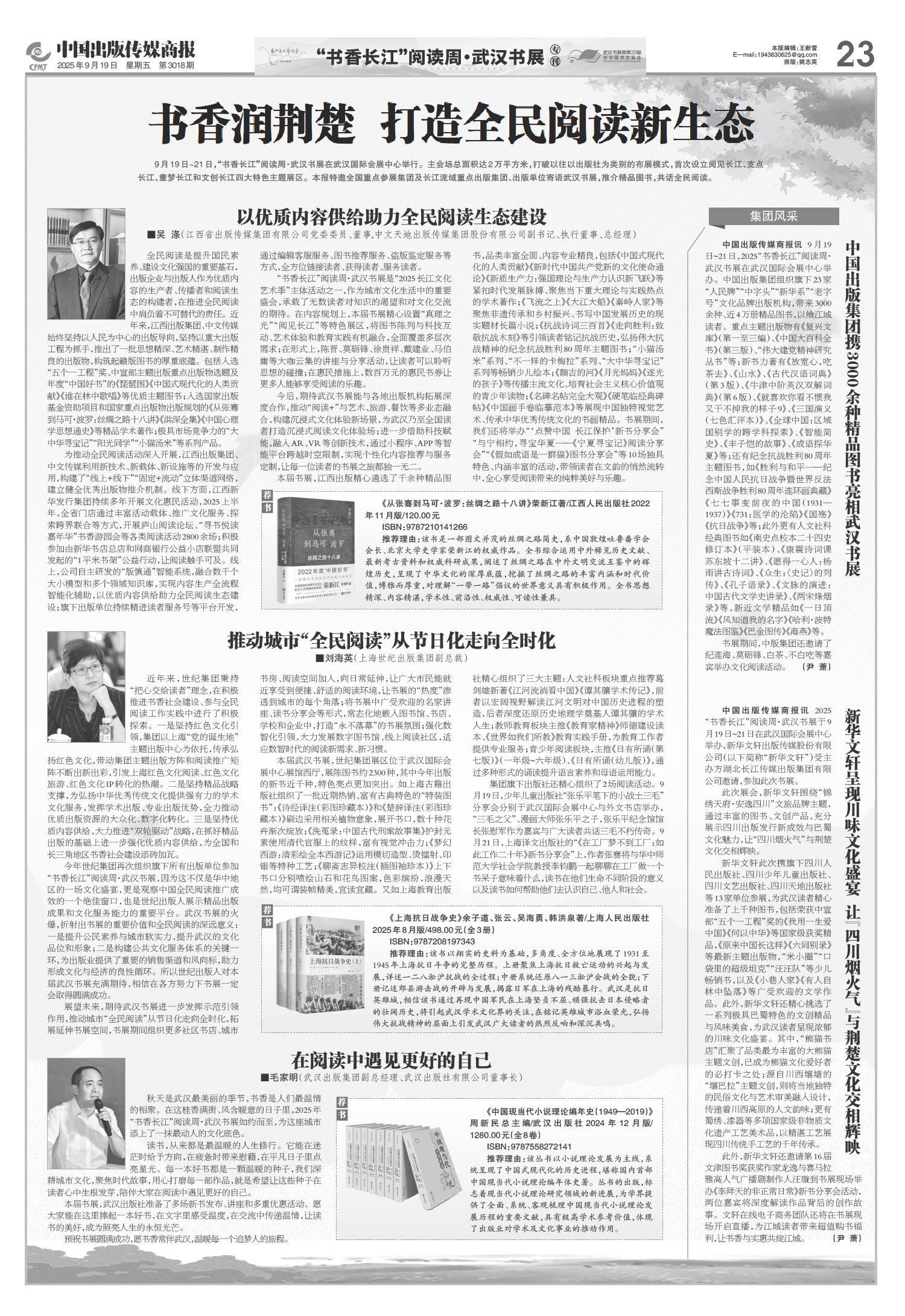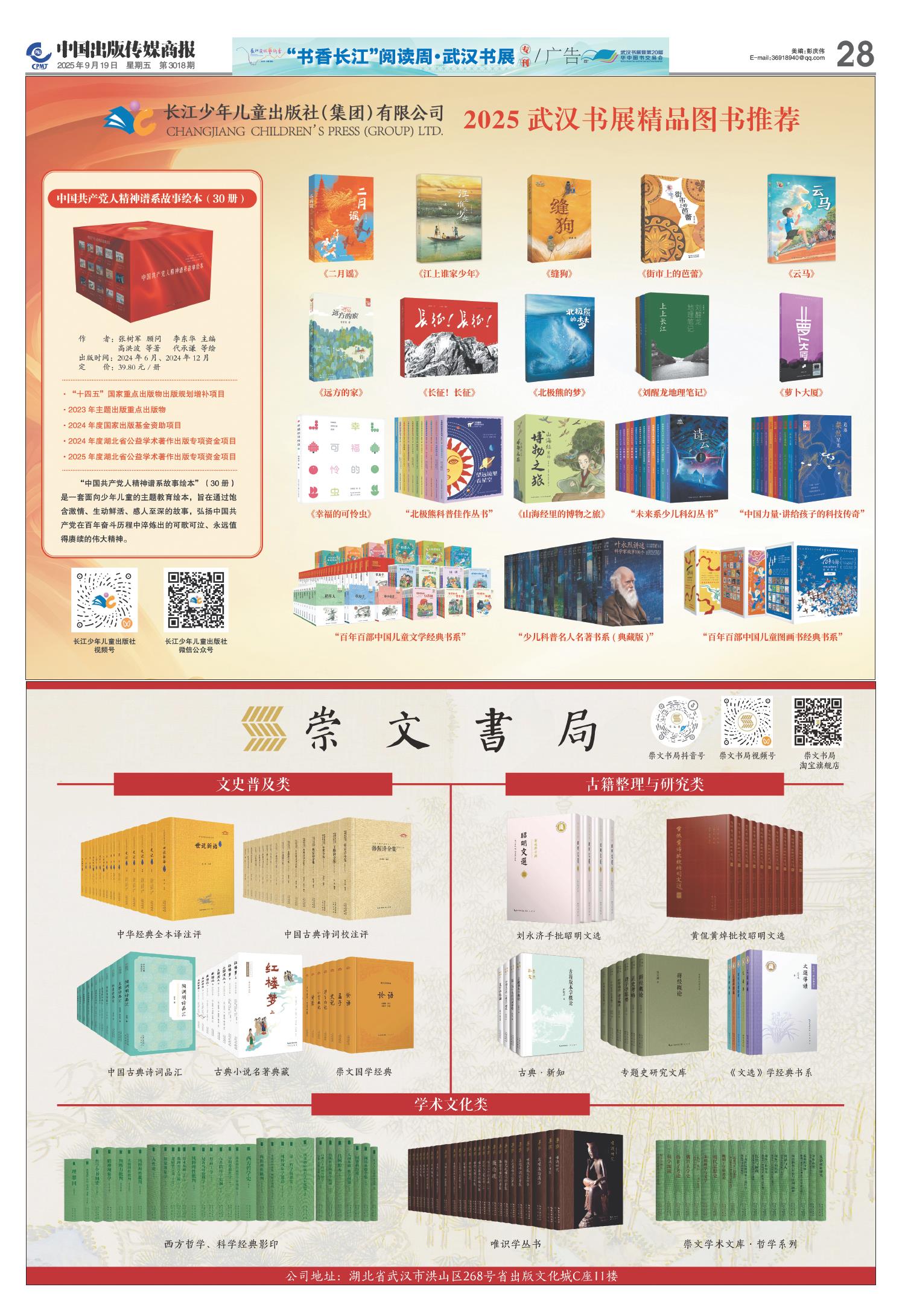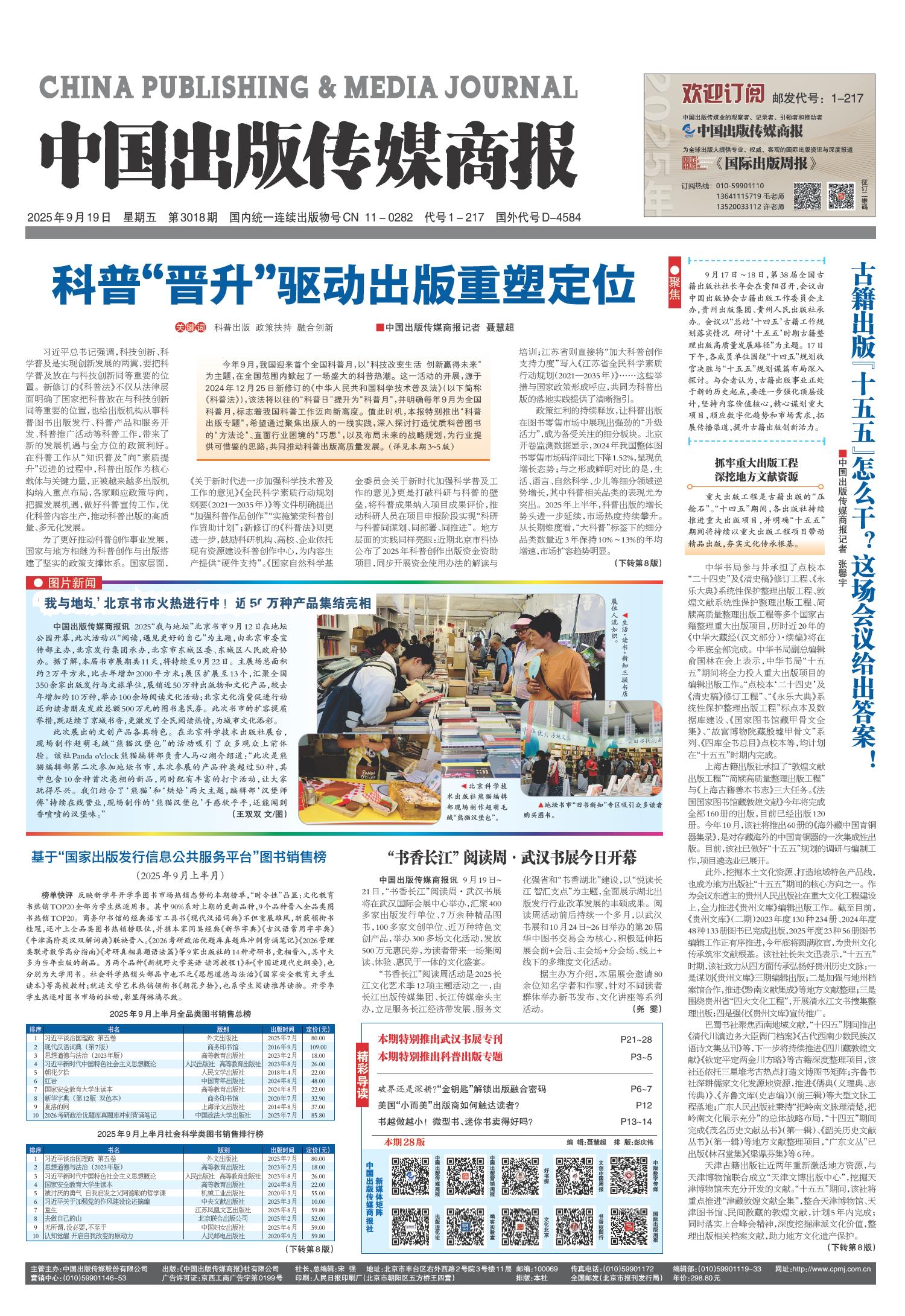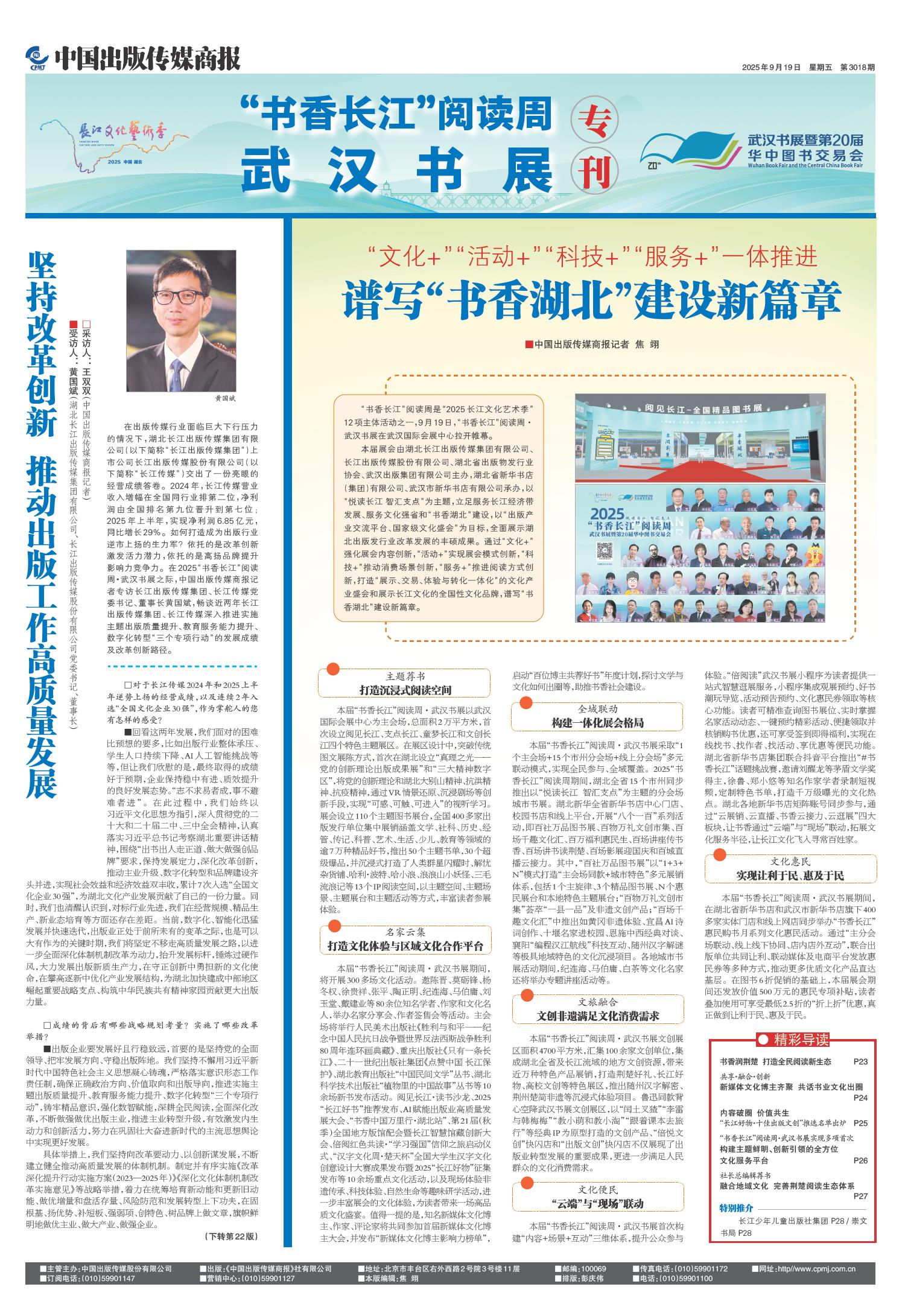01 一版要闻 02 出版报道/访谈 03 科普出版专题 04 科普出版专题 05 科普出版专题 06 融合出版 07 融合出版 08 综合 09 产业观察 10 分销新视野/创新营销人 11 分销新视野/书店文创 12 世界出版 13 出版报道 14 出版报道 15 出版报道 16 作家访谈 17 业者论坛 18 精品精荐 19 精品精荐 20 精品精荐 21 “书香长江”阅读周·武汉书展专刊 22 “书香长江”阅读周·武汉书展专刊 23 “书香长江”阅读周·武汉书展专刊 24 “书香长江”阅读周·武汉书展专刊 25 “书香长江”阅读周·武汉书展专刊 26 “书香长江”阅读周·武汉书展专刊 27 “书香长江”阅读周·武汉书展专刊 28 “书香长江”阅读周·武汉书展专刊/广告 29 中缝 30 中缝