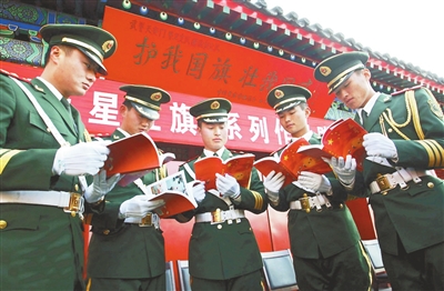 近日,带着全国人民对国旗护卫队的关爱之情,总政治部办公厅编研室历经十年倾心打造,受到军内外广泛关注和好评的《五星红旗》图书、画册和电视文献片光盘等系列作品赠送给武警北京总队天安门国旗护卫队。李光印/摄