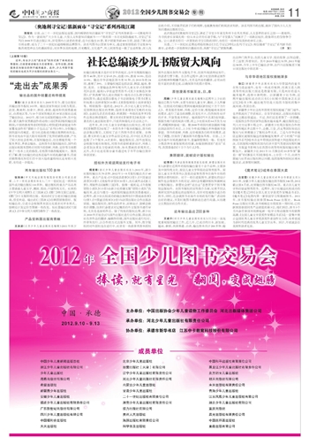 王建平(四川少年儿童出版社社长):川少社一直高度重视版权输出工作,近几年,已成功向日本、新加坡、越南、泰国,我国香港、台湾,输出图书共计200多种,输出品种门类齐全,包括儿童文学、低幼故事、认知启蒙、手工益智、科普知识。其中2010年输出51种,2011年输出58种,今年上半年已输出27种,在四川出版集团下属11家出版社中排名第一。