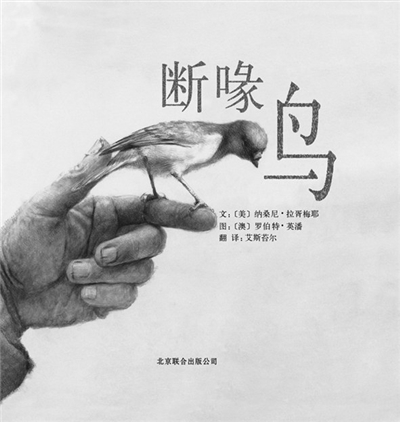 《断喙鸟》画面有着直达人心的力量,除了画家具备的深厚的绘画功力,还表现在他高度的写实能力,尤其是其表现手法上。比如,独特的写实,这种手法形似摄影却又更加动人,摄影的画面往往是做“加法”,而书中那些几可乱真的图画却是依据表现的需要来取舍,往往是做“减法”,删除与主题无关的部分,增添加强效果的材料。罗伯特着眼于年幼麻雀的断喙与流浪汉的手,周围几乎留白,让人更加为故事的情绪牵动。