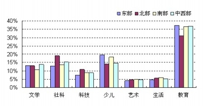 从各区域间的细分市场份额比较来看,社科类和科技类图书在北部市场的码洋份额领先其他各区域,少儿类和教育类在东部市场表现较为突出,南部市场中的艺术类和生活类份额较有优势,文学类在中西部市场的码洋份额则高出其在另三大区域一头。相对而言,北部市场在少儿类和教育类,东部市场在社科类、科技类、艺术类和生活类,南部市场在文学类的市场表现则较为不尽人意,上述几类图书在相应区域的码洋份额较其他区域市场为低。 (柏陈斌/执笔)