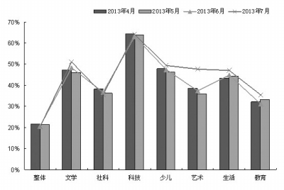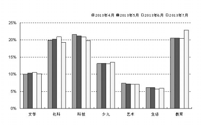 从各细分市场的市场集中度在近四个月的表现比较来看,文学类、少儿类、艺术类、生活类和教育类的市场集中度上升至近来最高,较低谷时的今年5月、5月、5月、4月和6月分别上升了5.14、2.94、11.79、3.69个和4.32百分点,社科类的市场集中度则为近4个月的最低点,较最高时的4月下降了2.48个百分点。