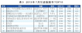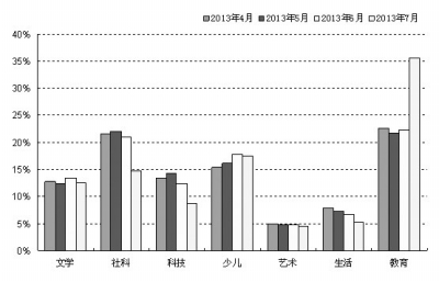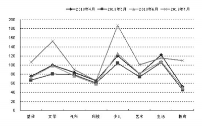2013年7月整体市场指数为106.0点,较上月上升了33.7点,环比升幅为46.61%。在各细分市场中,少儿类位列首位,指数为187.1点,文学类居次席,指数值为152.7,生活类、教育类和艺术类分居第3-5位,指数值分别为115.3、110.1和100.7,社科类和科技类指数低于100点,分别为90.1点和65.4点。和上月相比,教育类上升了3位,文学类上升了1位,生活类、艺术类、社科类和科技类各下降了1位,少儿类的排位与上月持平。