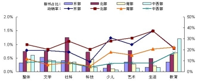 新书动销表现方面,2月北部地区整体动销品种最多,为1567种;东部其次,为1239种;南部达到748种;中西部最少,为549种。整体市场动销率方面,此次北部为四区最高,为24.78%。而比较细分市场在各区域的动销率表现,北部占据了大部分的第一,如下图5所示,除少儿类是东部最高,教育类是南部最高,生活类是东部市场并列最高以外,其余都是北部最高;而在各区域的细分市场动销率中,最高的是东部和北部的生活类,动销率都为37.25%,最低的是中西部的科技类,动销率为4.02%。
