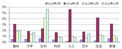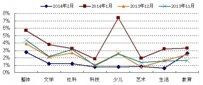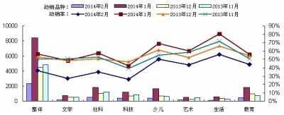 比较近四月的新书动销率表现,2013年11月到2014年2月呈现出逐步上升后下降的趋势,至1月达到最高,2月降至谷底。在细分市场动销的品种部分,2月与1月相比,动销品种数全部下降,其中教育类下降最多,达到1376种。再看细分市场的动销率,同1月相比亦全部下降,其中下降最多的为生活类,降幅为24.85个百分点。并且在近四月中,2月的表现也最为低迷,整体和细分均为最低点。