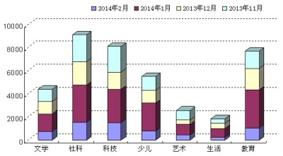 再看近四月的上架规模变化,如图1所示,2013年11月起近四月的整体市场的上架规模分别为9528种、8451种、14941种和6323种,呈现出上下波动的走势,到1月升至最高,2月降至谷底。1月有大量新书上架,为春节做准备,而进入2月,春节假期工作日较少,上架品种大幅回落,也在情理之中。