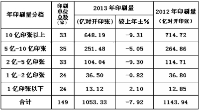 由中国报业协会印刷工作委员会开展的2013年度全国报纸印刷量的调查统计工作近日结束,通过对中央各报、各省市自治区,以及部分地市报纸印刷厂共计149家印刷单位上报2013年的相关数据统计和分析得出,该149家报纸印刷单位2013年的报纸总印刷量为1053.33亿对开印张。