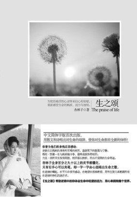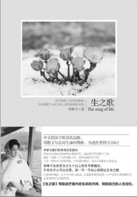 林杏子的两部经典之作《生之歌》、《生之颂》近期被引进出版,《生之歌》是杏林子献给母亲的60岁生日礼物,她希望借该书化小爱为大爱,鼓舞无数在黑暗中挣扎的心灵。《生之颂》是杏林子的散文诗作品,为《生之歌》的姊妹篇,道出她对生命的认识,这是献给父亲的70岁生日礼物。 (欣欣)