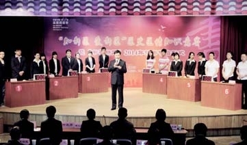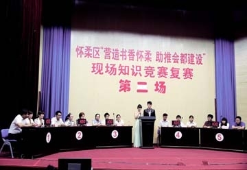 “营造书香怀柔助推会都建设”知识竞赛活动:“营造书香怀柔·助推会都建设”现场知识竞赛是第七届怀柔区全民阅读活动的重点。经过各单位初赛、区级复赛的层层选拔,来自18个单位的6支代表队进入决赛。决赛现场一改传统的“你问我答”的模式,引入多媒体设备,将所有题目显示在大屏幕上,并附加图片、音乐、VCR说明,既提高了比赛的趣味性,也使知识竞赛更加直观、现场参与性更强,这也成为本次比赛中最为抢眼的两大亮点。