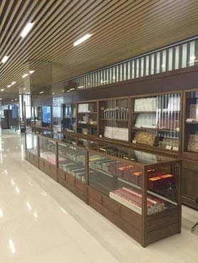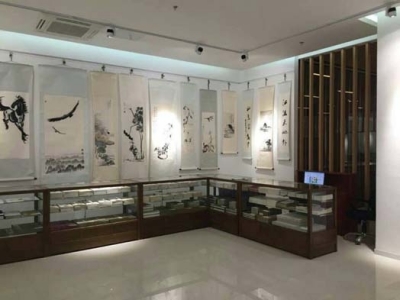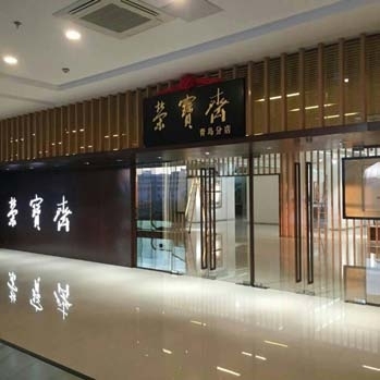 荣宝斋青岛分店位于青岛市崂山区秦岭路8号金石馆2楼,周边城市配套完善,风景秀美,交通便利。分店内部装饰融合古典美与现代时尚,格调明快、亮丽,体现了百年老店荣宝斋的创新发展和基业长青。分店总面积2000多平方米,设有画廊、文房用品厅、木版水印厅、书屋、茶室和展览厅。画廊:古朴典雅,展览销售近现代大家和当代名家的精品力作,包括山东和青岛当地知名书画家的艺术精品。文房用品厅:主要经营湖笔、徽墨、宣纸、端砚、印泥等中高端文房用品。木版水印厅:主要经营国家级非物质文化遗产——荣宝斋木版水印作品,包括齐白石、张大千、徐悲鸿、吴冠中、黄胄、启功、王雪涛、范曾等名家名作的木版水印作品。书屋:主要经营荣宝斋出版社出版的艺术书刊,包括《荣宝斋画谱》、《荣宝斋珍藏》、《荣宝斋书谱》等精品图书和《荣宝斋》、《艺术品》两种在国内很有影响的艺术期刊。茶室:为顾客和艺术家提供品茗、休闲的场所并经营荣宝斋高端古树普洱茶。展览厅:用于举办书画艺术展览等活动,为艺术家搭建展示和交流的平台。