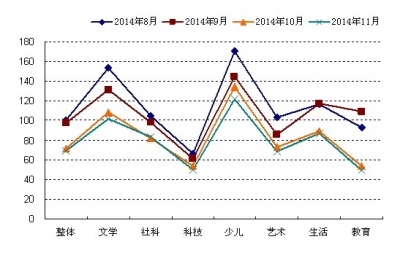 2014年11月整体市场指数为69.3点,较10月下降了2.1点,环比降幅为2.94%。在各细分市场中,少儿类位列首位,指数值为122.0,文学类列次席,指数值为102.1,生活类、社科类、艺术类、科技类和教育类的指数值低于100,分别为86.8、83.1、68.8、50.3和49.7。与10月相比,各类指数的位次均没有发生变化。
