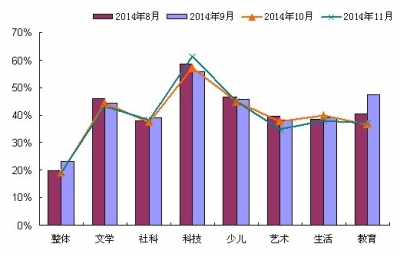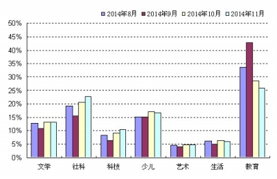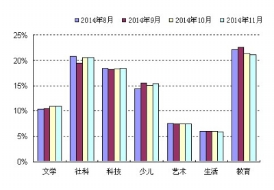 从各类别码洋份额的环比增减来看,有3类图书的码洋份额较10月上升,4类下降,上升的类别为社科类、科技类和教育类,分别上升了2.33、1.29和0.11个百分点,艺术类、生活类、少儿类和教育类则分别下降了0.10、0.42、0.69和2.61个百分点。从各细分市场的码洋份额在近4个月的表现比较来看,文学类、社科类和科技类图书的码洋份额在11月达到近4个月来的最高值,分别较最低时的9月出现不同程度的上升,上升了2.44、7.37和3.96个百分点,教育类则居于近4个月中的最低值,较其码洋份额最高时的9月下降了16.98百分点。各大类图书的二级类别中,社科类的下属类别政治类和科技类下属的医学类上升明显,分别上升了1.14和0.97个百分点,相反,教育类下属的文化教育类则下降较为明显,下降了1.83个百分点。