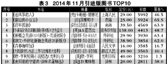 在引进版图书的来源地方面,前10名图书中,源自英国的图书品种最多,有4种入榜,引进地为美国的图书有3种入榜,法国、哥伦比亚和日本则各有1种入围。在出版社方面,TOP10引进版图书中南海出版公司和外研社各有2种入榜,商务印书馆、上海人民出版社、人民文学出版社、浙江人民出版社、光明日报出版社和译林出版社则各有1种图书入榜。在图书类别方面,文学类、教育类、少儿类和社科类分别有5种、3种、1种和1种入榜。在出版时间方面,2014年、2013年和2012年出版的引进版图书各有1种、2种和1种入围,2011年及以前出版的图书则有6种。在本次的引进版榜单中,较为引人注目的是法国作家帕特里克·莫迪亚诺的小说《青春咖啡馆》,作者获得本年度的诺贝尔文学奖的光环令4年前出版的该书一举进入本期的引进版前十之中。