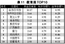 11月品种份额的三强类别为教育类、社科类和科技类,三者的品种份额分别为21.09%、20.47%和18.41%。在其他几类中,少儿类和文学类的品种份额分别为15.43%和10.88%,艺术类和生活类的品种份额相对较低,分别为7.50%和5.84%。