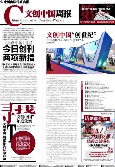 随着国家大力推进文化产业大发展、大繁荣,文化体制改革深入发展,文化创意产业受到了各方高度重视,实现了快速发展。党的十八届三中全会提出:“加快完善文化管理体制和文化生产经营机制,建立健全现代公共文化服务体系、现代文化市场体系,推动社会主义文化大发展大繁荣。”在此背景下,2013年11月15日,《中国出版传媒商报》子报《文创中国周报》创刊。