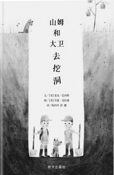让我们顺着故事和画面往下看:两个孩子很快挖出了超过自己身高的深洞,这进度是任何现实中的小孩所不能达到的,这时画面里出现了隐藏在右边泥层里的巨大宝石,这是孩子想得到的东西(他们一开始就说要挖到“了不起的东西”)。再往下挖,宝石既藏在原来的地方,又隐伏在洞的下端。可他们决定改道了,往斜里挖,又往两边挖,这样,好像与宝石失之交臂了。后又往下挖,还是没挖到东西,画面上的宝石已变得天一般大(这象征着他们愿望的强烈),可惜他们看不见。其实作者一直在故弄玄虚,为的是突出孩子的遗憾和失望。到最后,他们带来的食品吃光了,身上的力气也用完了。他们坐下来休息,画面上的狗则想象着地层下面的骨头,这是对孩子饥饿的暗示和呼应。两个孩子睡着了,狗窜下去找骨头,地层破了,人和狗都往下掉,越掉越深,越掉越深,结果,掉到了地面上。狗找到了想要的骨头,孩子们也心安理得地回家了。——很显然,后面的往下掉并一直掉到地面,是睡梦中的境遇;回家,则是现实的、梦醒后的事。这时候的家,和该书开始时一样,有同样的房屋、盆花、风向标,还有那棵重要的树。