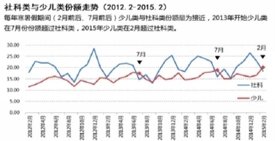 据商报·东方数据监测的2015年2月全国图书零售市场显示,长期在细分市场份额位居第三的少儿类首次在2月超过了社科类,跃居第二。