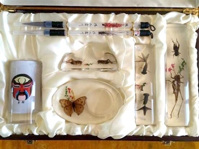 推荐理由:“中华文房四宝精品套装”是利民琥珀工艺参加第二届河北省文化创意设计大赛的参评作品。该套装包含琥珀笔架、琥珀砚台、琥珀小镇尺、琥珀大镇尺、水晶内画毛笔、水晶内画笔筒6件。