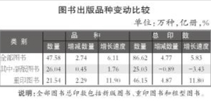 出版结构方面,重印图书比重加大,少儿图书出版增长逾1成。2015年,全国共出版图书47.58万种,同比增长6.1%,总印数86.62亿册,同比增长5.83%。其中重印图书品种达21.5万种,占45.3%,总印数达46.2亿册,占53.3%,品种比重、总印数比重均较上年加大。少儿图书出版3.7万种,同比增长11.9%;总印数5.6亿册(张),同比增长11.8%。当年累计印数超过百万册的书籍达68种,比上年增加。特别是2015、2016两年,“主题出版”所带来的顶层设计思路,不仅影响和改变党建读物、时政读物和大众通俗理论读物,还有可能进一步影响诸如青少年读物等出版类型和类型出版,甚至改变整体出版格局。一些出版企业将自身的专业特色融入其中,并受到市场认可。