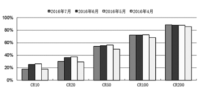 2016年7月,整体市场中CR10、CR20、CR50、CR100和CR200分别为17.81%、30.13%、53.95%、72.19%和88.80%。从环比来看,CR10、CR20和CR50环比下降,降幅分别为7.28、6.00和1.14个百分点;CR100和CR200上升,环比升幅分别为0.01和1.01个百分点。从近四个月CR10表现来看,整体市场CR10先升再连续两个月下降,为近四个月次低值,较2016年6月和5月分别下降7.28和8.51个百分点,较2016年4月上升0.05个百分点,市场份额集中趋势有所缓和。