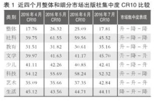 细分市场中,科技类的CR10最高,为52.32%;其次是文学类和社科类,分别为45.70%和45.52%;教育类最低,为35.16%。从CR10环比来看,艺术类领涨,环比上升5.49个百分点;教育类、文学类和少儿类的环比升幅分别为4.55、4.53和1.56个百分点;其余各类的CR10均有不同程度的下降,社科类领降,降幅为14.04个百分点;科技类和生活类分别环比下降5.92和0.60个百分点。艺术类的CR10为近四个月最高值;教育类、文学类、少儿类和科技类的CR10为近四个月次高值;社科类和生活类的CR10为近四个月次低值。
