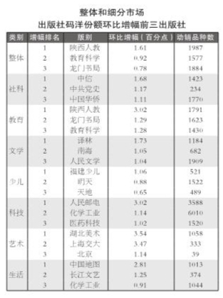 2016年7月,整体市场出版社码洋份额环比增长前三位的出版社分别为陕西人民教育出版社、教育科学出版社和龙门书局,环比升幅分别为1.61、0.92和0.78个百分点。三者的主要类别均为教育类,分别占其码洋份额的97.61%、99.13%和98.49%;其代表图书分别是“教材全解”系列、“5年中考3年模拟”系列和“小状元作业本”系列。