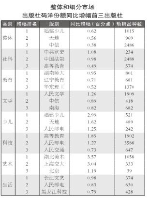 2016年7月,整体市场出版社码洋份额同比增幅前三位的出版社分别为福建少年儿童出版社、天地出版社和中信出版社,码洋份额分别同比上升了0.62、0.56和0.38个百分点。福建少儿社的主要图书类别为少儿类,占其码洋份额的86.75%;其畅销冠军是《童年真好》。天地出版社的主要类别为少儿类和教育类,分别占其码洋份额的46.10%和42.13%;前者的畅销冠军是《十万个为什么》,后者的代表图书为“新课标经典文学名著金库”系列。中信社的类别比较分散,社科类、文学类和少儿类分别占其码洋份额的53.59%、23.72%和16.46%,以上三个分类的榜首书依次是《向着光亮那方》《人类简史:变成神的这种动物》和《疯狂动物城/迪士尼绘本故事书》。