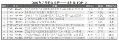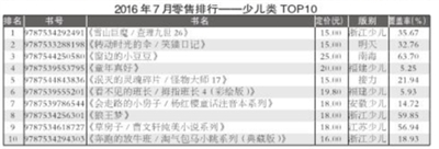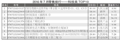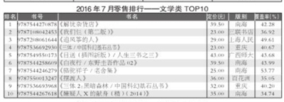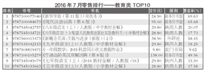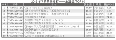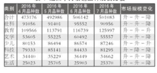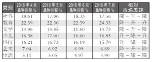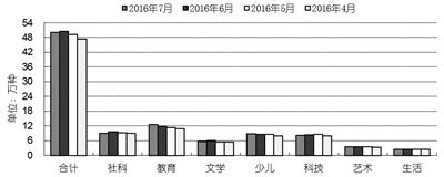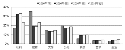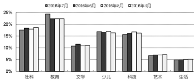 2016年7月,教育类重登榜首,码洋份额为35.26%;少儿类升至榜眼,码洋份额为19.64%;社科类降至第三,码洋份额为17.20%;文学类以14.44%的码洋份额位列第四;科技类位列第五,码洋份额为5.74%;生活类和艺术类的码洋份额低于5%,分别为3.25%和3.62%。