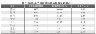 2016年7月,整体市场新书动销5425种,新书零售占比为1.52%。在新书各细分市场中,教育类的动销品种数最多,为2749种,新书品种份额为50.28%;少儿类位列榜眼,新书品种份额为13.35%;社科类第三,新书品种份额为12.73%;科技类和文学类的新书品种份额位居中游,分别为8.21%和7.83%;艺术类和生活类的新书品种份额相对较低,分别为3.91%和2.91%。在新书的零售占比方面,生活类新书占比最高,为2.49%;其次是教育类,新书占比为2.23%;科技类的新书占比相对较低,仅为0.51%。 (郑 佳 毛丽颖/执笔)