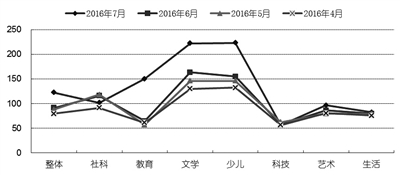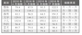 2016年7月,整体市场指数为122.5点,在2016年前7个月中居于首位;较6月上升31.2点,环比升幅为34.22%,为自2016年5月以来连续三个月环比上升。七类细分市场中,少儿类跃居榜首,指数值为223.1点;文学类降至次席,指数值为222.2点;教育类升至前三,指数值为150.3点;社科类降至第四,指数值为101.5点;艺术类降至第五,指数值为96.3点;生活类降至第六,指数值为82.3点;科技类仍居最末,指数值仅为56.5点。与6月相比,教育类上升3位,少儿类上升1位,科技类持平,文学类、社科类、艺术类和生活类均下降1位。