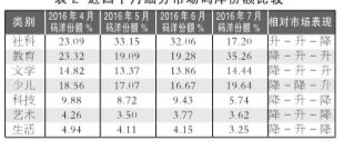 从整体市场和各细分市场指数在近四个月的表现比较来看,整体指数连续走高,7月位于近四个月中的最高位。细分市场中的教育类、文学类、少儿类、艺术类和生活类处于近四个月中的最高位;社科类和科技类处于近四个月中的次低位。