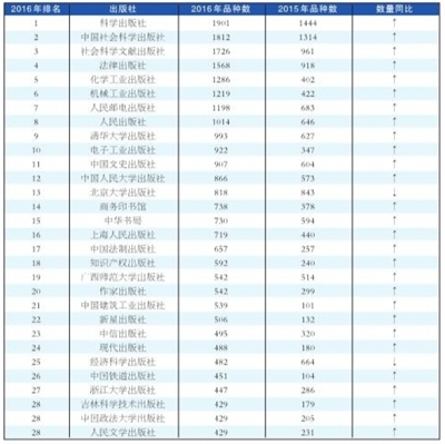 一些大社、强社知识生产能力持续保持较高的发展水平,而其中以专业出版社的品种增长幅度最为突出、出版领域大幅拓宽。这个判断可以从2016年品种数量前30家出版社中得到验证。表3是2015年、2016年前30家的出版社排名变化对比图。