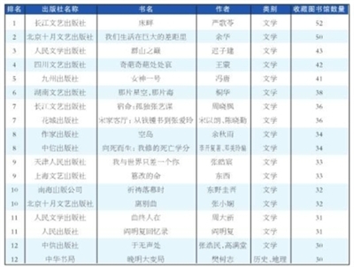 排在今年榜首的,与2015年一样,依然是严歌苓的作品,今年上榜的是她的新作《床畔》(长江文艺出版社),全球收藏图书馆为52家,仅有10家大学图书馆,其余41家为公共图书馆。(详见表4)