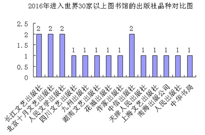 在海外30家以上图书馆馆藏的18种图书的出版社中,其中人民文学出版社、长江文艺出版社、北京十月文艺出版社、中信出版社分别有2种上榜,其余四川文艺出版社、九州出版社、湖南文艺出版社、花城出版社、作家出版社、天津人民出版社、上海文艺出版社、南海出版公司、人民出版社、中华书局各有1种。14家出版社,除九州出版社、人民出版社、中华书局、天津人民出版社不是专业的文学出版机构之外,其余10家均为中国一流的文艺社,显示了中国主流文学出版机构在世界图书馆系统所具有的品牌影响。(详见图1)
