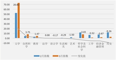 如图2所示,从新书供给的角度来看,通过对比分析中国青年阅读指数 2月份和 3月份的数据发现,文学阅读域供给量增加,历史阅读域供给量减少。文学指数从 2月份的 52.12上升至 3月份的 72.95,上升幅度最大,达到 20.83。供给指数上升的阅读域还有自然科学(上升 3.75)和教育(上升 1.47)。历史阅读域指数从 2月份的 11.93下降至 3月份的 2.67,下降幅度最大,达到 9.26。此外,经济金融管理供给指数下降 5.67,工学供给指数下降 5.52,哲学及社会科学供给指数下降 3.65。法学、语言学供给量较稳定,两月指数变化不大。