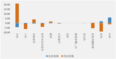 通过分析可以发现,中国青年需求指数和中国青年供给指数二者大致出现相互背离的趋势。如图3所示,文学、自然科学及教育阅读域需求指数下降较多,但供给指数却大幅上升;艺术、历史及经济金融管理阅读域需求指数上升较快,但供给指数却大幅下降。工学、哲学及社会科学、生活相关阅读域需求及供给均有所下降;法学、新闻传播广告及语言学阅读域需求及供给变化不大,相对稳定。