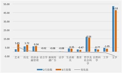 如图1所示,艺术阅读域更受青年读者的青睐,文学阅读域需求量逐渐下降。艺术指数从 2月份的 2.89上升至 3月份的 8.74,上升幅度最大,达到 5.85。需求指数上升的阅读域还有历史(上升 1.72)和经济金融管理(上升 0.34)。文学指数从 2月份的 52.45下降至 3月份的 47.91,下降幅度最大,达到 4.53。此外,工学需求指数下降 1.05,自然科学需求指数下降 0.77,哲学及社会科学需求指数下降 0.56。语言学、新闻传播广告、法学需求较稳定,两月指数变化不大。