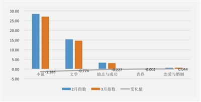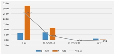 文学阅读域细分中的小说阅读域供给指数从 2月份的 17.70迅速增至 3月份的 62.77,上升了 45.07。与青春文学相关的供给量青春、恋爱与婚姻在减少,励志与成功在增加。励志与成功从 2月份的 7.11增至 3月份的 11.51,增长 4.39。小说阅读域供给量的增加,某种程度上也是青春文学中小说供给的风向——上浮。