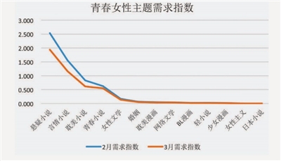 一些扁平化标签本身可以反映出许多内容,如“素描”标签2月份、3月份指数呈明显增长趋势,结合高校艺术专业招生考试时间,可以看出其增长的内在逻辑。这些扁平化标签的不同组合又可以产生不同的阅读域,以供多用途的学术或商业应用。指数第三部分的“专题解读”就是这种应用的典型案例。如在《青年女性阅读研究》中,作者李天豪以言情小说、耽美小说、青春小说、女性文学、耽美漫画、网络文学、少女漫画等标签定义青年女性阅读域,从标签加总指数中看出女性文学的重要地位。
