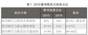 数据显示与2015年对比,2016年全民阅读及消费鸿沟持续收窄,图书消费相对均衡。从国民图书消费总量来看,广东、北京、江苏前三名头部省份图书消费占比从42%下降至34%;购书力排名第4~17位腰部省份,图书消费占比从47.1%提升至53%;购书力排名第18~34位后半段省份,图书消费占比从10.9%提升至13%。(见表1)