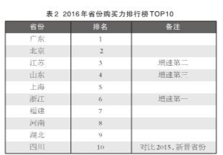 2016年,广东、北京、江苏稳居我国图书购买力最强省份(直辖市)TOP3,TOP10省份中图书消费增速排名前三位为浙江、江苏、山东;值得注意的是,位于西南腹地的四川成功超越东北工业大省辽宁挤进图书消费TOP10。(见表2)