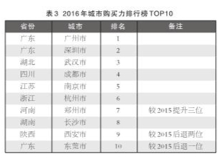 在全国城市购买力排行榜中,郑州进步神速,从2015年的第10名晋升到2016年的第7名,西安、东莞分别退后两位和一位。广州、深圳、武汉、成都、南京连续2年稳居书香城市TOP5。(见表3)