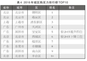 书香十区:朝阳群众地位稳固 北京西城跌破前五在全国城区购买力排行榜中,北京市朝阳区群众仍居首位,北京市西城区跌破前5,深圳市宝安区大跨步迈进前5。(见表4)
