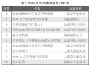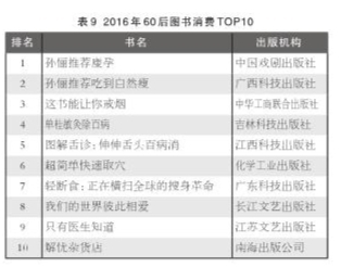 现如今,“90后”已全线步入高等教育年龄段,图书消费增速领衔,是教辅消费主力军;“80后”成家立业,身兼自身和孩子阅读提升重任,是图书尤其童书消费的主力军;“70后”走上管理层,正努力奋斗成为社会的中坚力量,由此更关注《中国共产党章程》和《习近平总书记系列重要讲话读本》等时政类图书;“60后”进入天命之年,关注养生,最爱“娘娘”养生秘笈。(见表6~9)