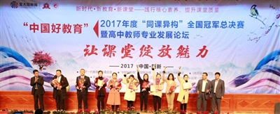 从12月27日下午到28日下午,令人激动的“同课异构”冠军大赛紧张角逐, 16位省级冠军进行了精彩纷呈的说课比赛,全面呈现高效课堂的精彩,由金太阳教育专家、全国联盟推荐名师组成的评委团对参赛老师进行评分与汇课点评。经过两天激烈角逐,第三届“中国好教育”2017年度“同课异构”全国总冠军于12月28日揭晓。