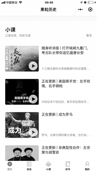 2018年,人民日报社主管主办的《国家人文历史》杂志社新媒体中心上线了基于微信小程序的知识付费平台,聚焦历史人文题材,升级阅读体验,包括《国家人文历史》电子刊物以及历史人文题材小课、学术专家讲座等内容。“果粒历史”小程序内包含有“杂志”“小课”以及“好书”三大板块,集音频产品、付费课程、数字阅读于一体。《看天下》杂志推出《VISTA看天下微杂志》互联网+智库产品、微刊APP,微杂志单期2元,同时推出周、月、季、年4个订阅套餐,最高年订阅价268元,这款产品也被称为“政商智库”。