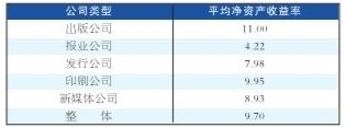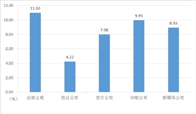 各类出版传媒上市公司的平均净资产收益率,降序依次为出版公司、印刷公司、新媒体公司、发行公司和报业公司。